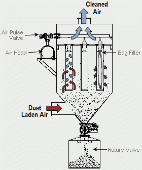 Dòng khí thải chứa bụi đi qua 1 tấm vải lọc, ban đầu các hạt bụi lớn hơn khe giữa các sợi vải sẽ bị giữ lại trên bề mặt vải theo nguyên lý rây, các hạt nhỏ hơn bám dính trên bề mặt sợi vải lọc do va chạm, lực hấp dẫn và lực hút tĩnh điện, dần dần lớp bụi thu được dày lên tạo thành lớp màng trợ lọc, lớp màng này giữ được cả các hạt bụi có kích thước rất nhỏ . Phương pháp này lọc được cả các hạt rất nhỏ là nhờ có lớp trợ lọc. Sau 1 khoảng thời gian lớp bụi sẽ rất dày làm sức cản của màng lọc quá lớn, ta phải ngưng cho khí thải đi qua và tiến hành loại bỏ lớp bụi bám trên mặt vải. Thao tác này được gọi là hoàn nguyên vật liệu lọc. Một số thiết bị lọc bụi túi vải hiện nay của công ty lắp đặt thêm bộ phân phối dòng khí nhằm để tăng hiệu quả xử lý.