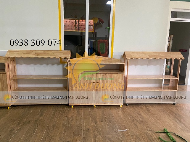 Tủ gỗ mầm non, kệ gỗ mầm non chất liệu cao su